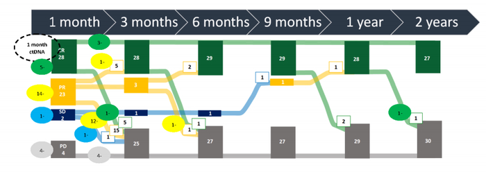 随着时间的推移,Axi-cel治疗的缓解情况见图13。Axi-cel治疗1个月,28例患者达到完全缓解(CR):5例患者为ctDNA阳性,其中2例患者出现PD;21例患者为ctDNA阴性,其中14例保持CR;2例保持CR的患者没有可用的ctDNA值。在同一评估时间点,25例患者处于PR状态:14例为ctDNA阳性,其中13例出现PD;8例为ctDNA阴性,其中6例转化为CR;1例PD患者没有可用的ctDNA值。2例SD患者:其中1例ctDNA阳性患者在3个月后出现PD,另1例ctDNA阴性患者在1年后达到CR。所有4例在1个月时出现PD的患者均为ctDNA阳性[5]。