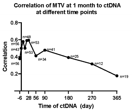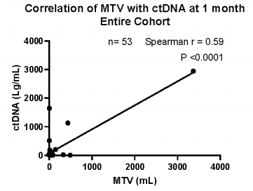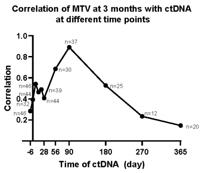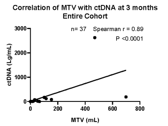3个月时,完整队列中(n=37)中,MTV与ctDNA的相关性最强(rs 0.89,P<0.0001)(图4)[5]。
