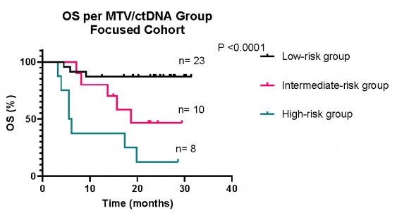 基线时,重点队列中,32例患者MTV较低(范围,2.3-145.86 mL),9例患者MTV较高(范围,166.18-2106.56 mL);24例患者ctDNA较低(范围,0-98.16 Lg/mL),17例患者ctDNA较高(范围,127.92-6542.75 Lg/mL)。与高MTV和高ctDNA相比,低MTV和低ctDNA与更好的PFS(HR=0.17,95%CI,0.03-0.71,P<0.0001;HR=0.11, 95%CI,0.04-0.3, P<0.0001)和OS(HR=0.19, 95%CI,0.04-0.8, P=0.0003;HR=0.13, 95%CI, 0.04-0.39, P=0.0002)显著相关。低MTV/低ctDNA患者(低风险组)的生存期优于低MTV/高ctDNA、高MTV/低ctDNA患者(中风险组)或高MTV/高ctDNA患者(高风险组)的患者(图11,图12)[5]。