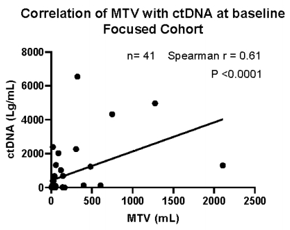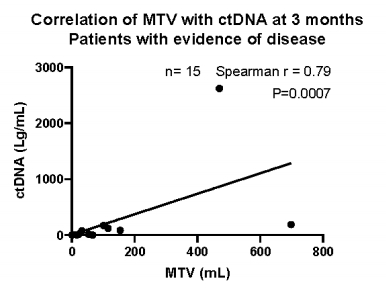 图6 Axi-cel治疗后3个月,有疾病证据的患者MTV与ctDNA的相关性