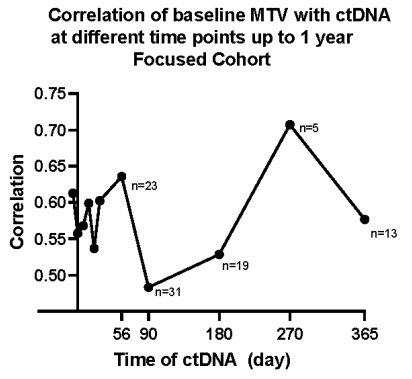 研究进一步评估了在三个时间点获得的MTV与所有ctDNA值之间的关系。重点队列中,基线MTV与清淋前的ctDNA相关性最强(r 0.61,P<0.0001)。与之后的时间点相比,第1个月的相关性变化更大(图7)。