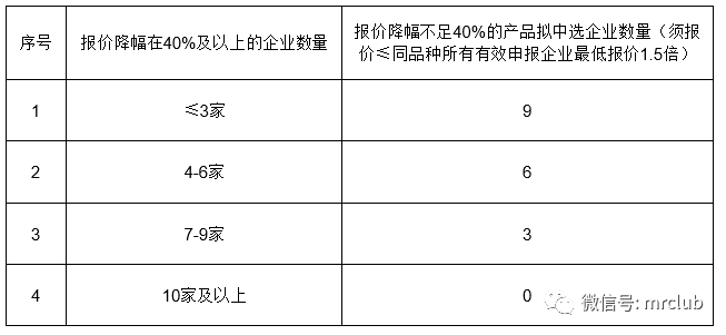 报价降幅不足40%的企业若获得拟中选资格,须报价≤同品种所有有效申报企业最低报价1.5倍,且视报价降幅达到40%及以上企业的数量,按照报价由低到高顺序确定,如下表所列: