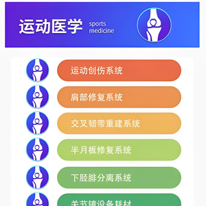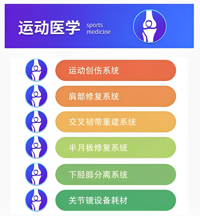 运动医学主要通过全关节镜下或关节镜辅助下的微创手术,对韧带、关节囊、肌腱等软组织进行形态修复和功能重建,主要代表产品包括关节镜系统(关节镜、动力系统、辅助设备等)以及植入物(固定物、软组织重建物、配套工具等)。