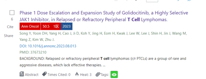 [1]荣登国际顶刊!迪哲医药全球首款T细胞淋巴瘤JAK1抑制剂戈利昔替尼研究成果刊于《肿瘤学年鉴》,影响因子高达51.8. Retrieved Sep 09,2023, From https://mp.weixin.qq.com/s/Tt7CMQWiIG83aQt8IKG6XQ