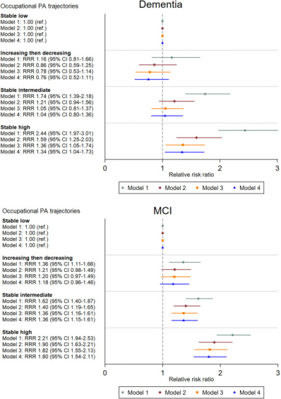 在模型1和模型4中,研究人员发现相比于稳定从事低强度体力劳动群体,稳定从事中强度体力劳动群体和稳定从事高强度体力劳动群体均具有更高的痴呆和MCI风险,而早期从事高强度后期从事低强度体力劳动群体患MCI的风险更高,但不是痴呆。