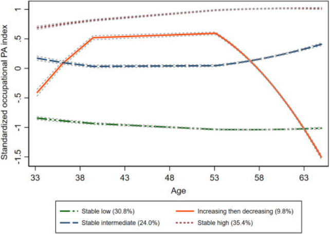 根据33-65岁时标准化职业PA的轨迹图构建了四组最终轨迹模型用于最终统计分析,分别是稳定从事低强度体力劳动群体(30.8%)、早期从事高强度后期从事低强度体力劳动群体(9.8%)、稳定从事中强度体力劳动群体(24.0%)和稳定从事高强度体力劳动群体(35.4%)。