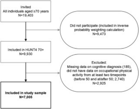 此研究数据来自挪威Trøndelag健康研究(HUNT4 70+,2017-2019)第四波70+子研究,经过筛选,最终纳入7005名年龄在70-105岁(出生于1914-1949年)的参与者,他们的认知评估数据和职业PA数据来自两个时间点:在50岁之前和在50岁或之后。由于缺乏30-32岁年龄段的职业数据来创建30岁开始的轨迹,因此轨迹仅包括33-65岁的职业PA。