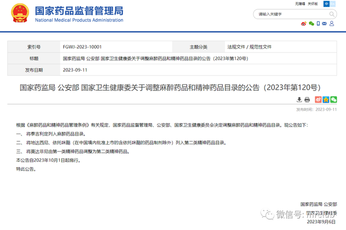 9 月 11 日,国家药监局、公安部、国家卫生健康委发布《关于调整麻醉药品和精神药品目录的公告》(2023年第120号),根据《麻醉药品和精神药品管理条例》有关规定,国家药品监督管理局、公安部、国家卫生健康委员会决定调整麻醉药品和精神药品目录。