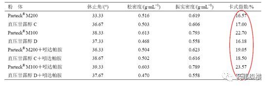 一般来说,卡式指数在25%以下时流动性较好,卡式指数越小,粉体的填充性越好,相反卡氏指数较大,可压性好。通过表1可以看出除Parteck® M100 直压甘露醇外的3 种型号甘露醇及其混合药物后测得的卡式指数均小于20%,而Parteck® M100 直压甘露醇及其混粉的卡式指数也不大于25%,在填充性和可压性方面各有所长。