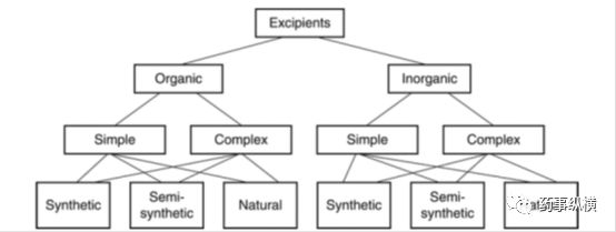 辅料可以有多种分类方式,如下图可见,包括有机辅料、无机辅料,每类别根据结构不同都可以分为简单(结构简单、明确)和复杂(结构复杂、不明确)的,根据来源不同,分为合成、半合成、天然的辅料。