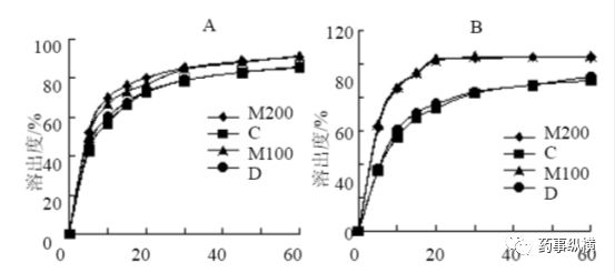 图1. 片剂在水(A)、0.1mol/L 盐酸(B)、pH 4.5 醋酸缓冲液(C)和pH 6.8 磷酸缓冲液(D)中的溶出曲线