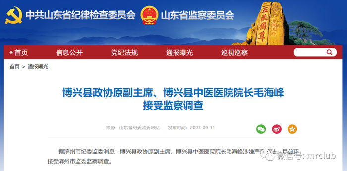 9 月 11 日,据山东省纪委监委网,博兴县政协原副主席、博兴县中医医院院长毛海峰涉嫌严重违法,目前正接受滨州市监委监察调查。