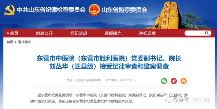 9 月 12 日,据山东省纪委监委网,东营市中医院(东营市胜利医院)党委副书记、院长刘丛华(正县级)涉嫌严重违纪违法,目前正接受东营市纪委监委纪律审查和监察调查。