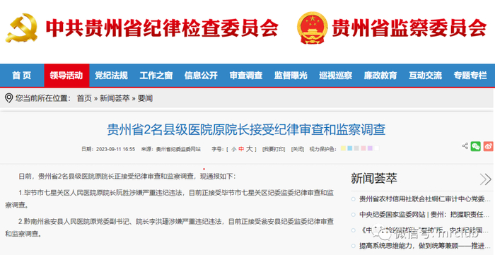 9 月 11 日,据贵州省纪委监委网公告,日前,贵州省2名县级医院原院长正接受纪律审查和监察调查,通报如下: