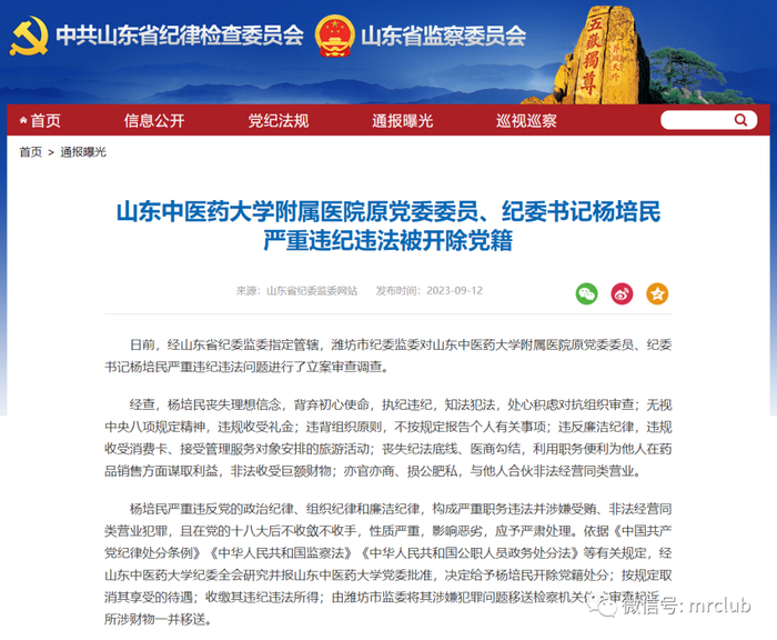 9 月 12 日,据山东省纪委监委网,日前,经山东省纪委监委指定管辖,潍坊市纪委监委对山东中医药大学附属医院原党委委员、纪委书记杨培民严重违纪违法问题进行了立案审查调查。