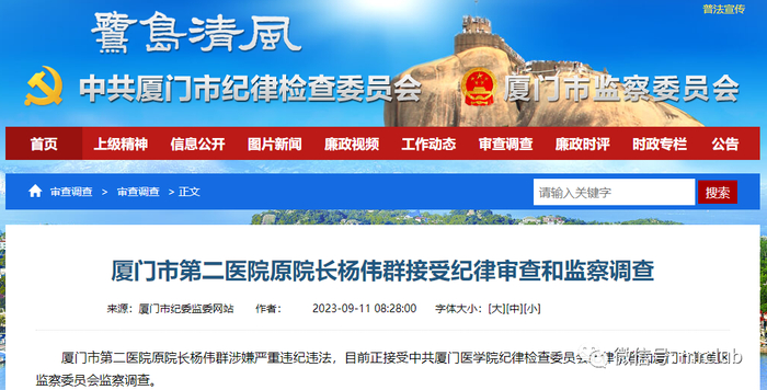 9 月 11 日,据厦门市纪委监委网,厦门市第二医院原院长杨伟群涉嫌严重违纪违法,目前正接受中共厦门医学院纪律检查委员会纪律审查和厦门市集美区监察委员会监察调查。