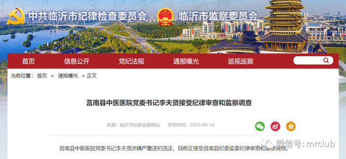 9 月 12 日,据山东省临沂市纪委监委网,莒南县中医医院党委书记李夫贤涉嫌严重违纪违法,目前正接受莒南县纪委监委纪律审查和监察调查。