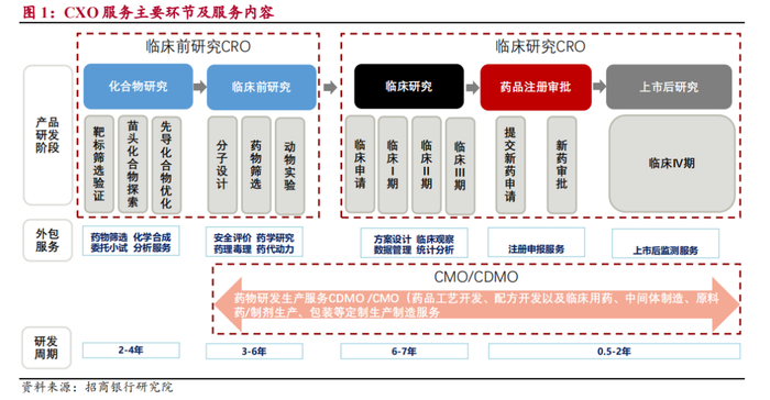 在服务内容方面,CXO(医药外包服务)分为CRO、CMO/CDMO、CSO三个不同环节,覆盖了制药企业从新药发现至最终商业化生产的各个环节。