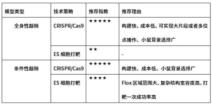 基因敲除方法有:ES细胞打靶和CRISPR/Cas9。具体选择敲除方法见下表