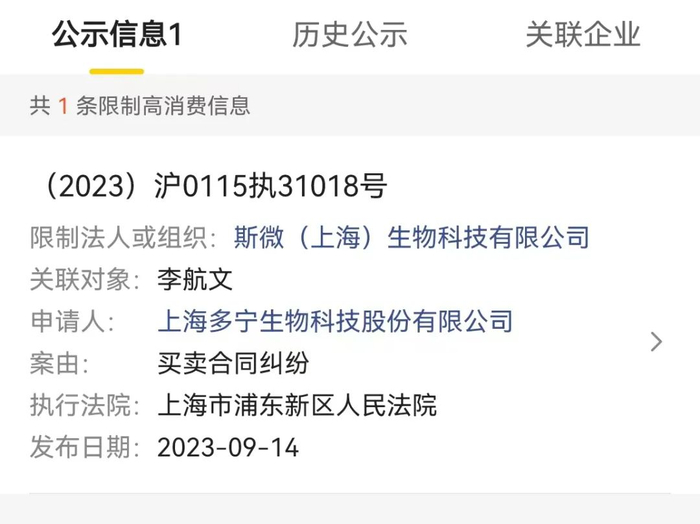 信息显示,此次申请对斯微生物执行“限制高消费措施”的是多宁生物,案由是买卖合同纠纷。