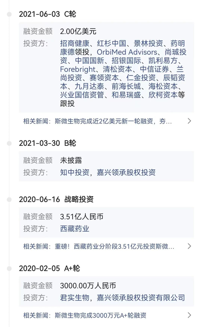 仅仅从2020年初到2021年6月,斯微生物就连续完成多轮融资,吸引了国内多家知名投资机构入局,甚至和此次对簿公堂的多宁生物,还有共同的投资机构股东。