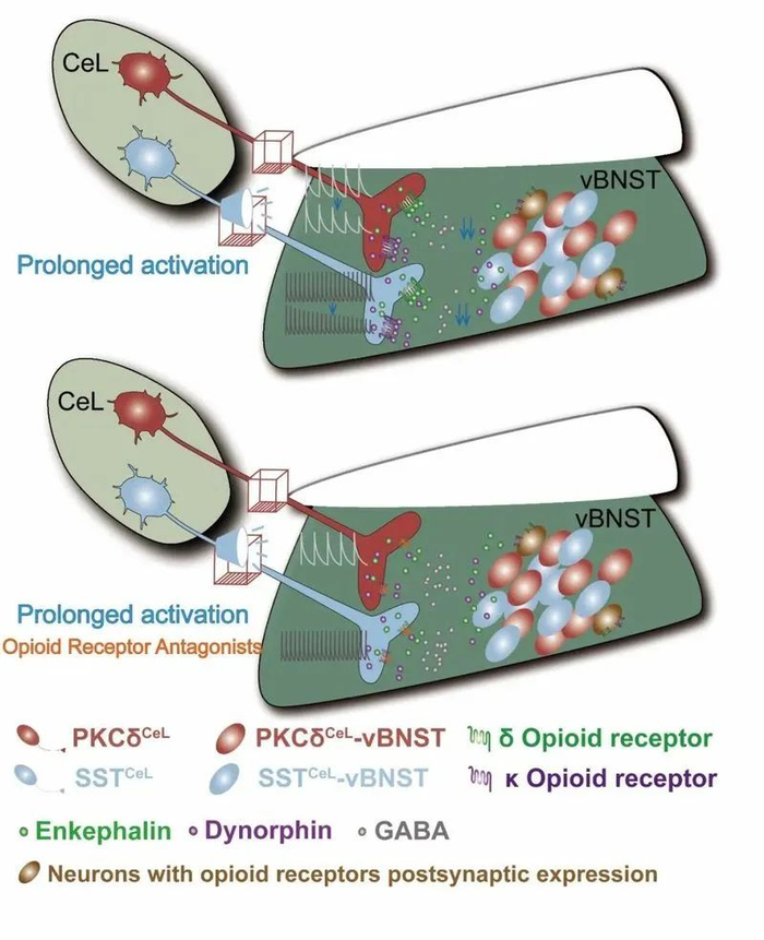 研究团队结合病毒示踪技术与免疫荧光手段,发现δ型阿片受体与κ型阿片受体存在于中央杏仁核对终纹床核投射的神经末梢。长时程光刺激此投射会导致适应现象(即投射强度的降低),而利用阿片受体拮抗剂可以阻断此现象。