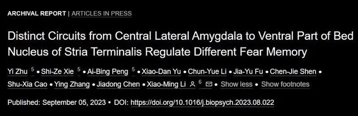 浙江大学医学院脑科学与脑医学学院、双脑中心李晓明团队研究发现:不同的恐惧信号会通过不同的神经环路形成特定的恐惧记忆。其中,从中央杏仁核外侧部PKCδ阳性神经元到腹侧终纹床核的GABA能通路介导场景恐惧记忆,而SST阳性神经元对终纹床核的GABA能通路介导线索恐惧记忆。研究成果以“中央杏仁核外侧部到腹侧终纹床核的不同投射介导不同恐惧记忆 (Distinct Circuits from Central Lateral Amygdala to Ventral Part of Bed Nucleus of Stria Terminalis Regulate Different Fear Memory)”为题,发表在《Biological Psychiatry》上。