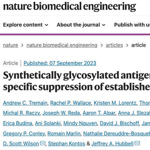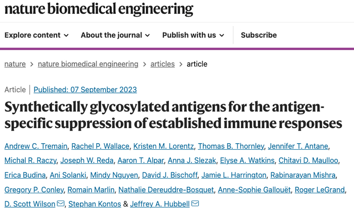 2023年9月7日,该研究以 Synthetically glycosylated antigens for the antigen-specific suppression of established immune responses 为题,发表在了Nature 子刊 Nature Biomedical Engineering 上。