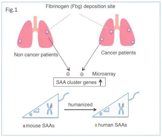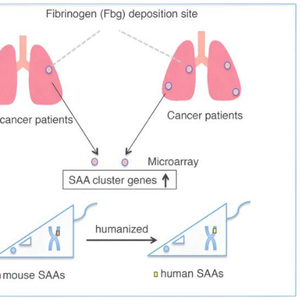当利用染料染色后,相比死亡时未患癌的患者而言,癌症患者机体肺部组织中纤维蛋白原阳性的区域会明显增加,随后的分析表明,血清淀粉样蛋白A基因(SAA,一种小鼠机体中已知的癌前转移基因)在癌症患者中的表达量是未患癌个体机体中的5倍。基于这一点,随后研究人员就开发出了人源化的SAAs小鼠,即通过遗传编程能产生兼容的人类SAA蛋白版本的啮齿类动物,不出所料的是,相比在阻断了SAA簇基因的小鼠中,肺部肿瘤的转移在人源化的SAA簇小鼠中会更加严重一些。接下来,研究人员在携带肿瘤的小鼠肺部中研究了SAA3蛋白和纤维蛋白原之间的相互作用,在实验过程中,研究人员发现,SAAs能介导纤维蛋白原的瓜氨酸化,并能将标准的氨基酸精氨酸转变为非标准的瓜氨酸。