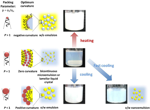 对于一个油-水-含聚氧乙烯基非离子型表面活性剂的体系,在温度较低(低于PIT)时,该表面活性剂的亲水头部是高度水合的,更倾向于溶于水中,自发曲率(spontaneouscurvarure)为正值,形成的乳液为O/W型。在高温(高于PIT)时,该表面活性剂的亲水头部水合程度减小,更倾向溶于油中,自发曲率为负值,形成W/O乳液。当温度为PIT时,体系中形成双连续相(bicontinuous phase)或液晶相(liquid crystallinephase),自发曲率接近为零,此时界面张力达到最低(10-2-10-5mN⋅m-1),形成细小的乳滴,但与此同时合并速率也达到最大[2],乳液极不稳定,易发生乳滴的合并(coalescence)。