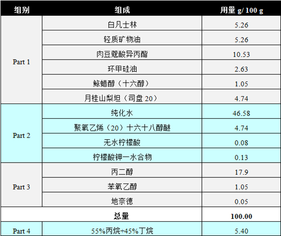 处方中Part 4为抛射剂(propellant),由丙烷和丁烷组成,它们均为碳氢化合物类抛射剂,是泡沫气雾剂产品中常用的抛射剂。抛射剂作为耐压容器中负责产生压力的物质,是喷射动力的来源。对于本产品而言当揿压阀门时,压力突然降低,抛射剂急剧汽化,容器内的纳米乳液以泡沫状喷出。