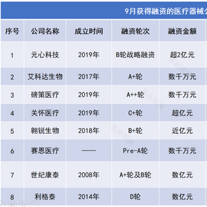 除了上述公司,还有其它创新医疗器械公司也在今年9月完成融资,限于篇幅,本文不再一一介绍。希望在资本的助力下,这些公司可以加快创新产品的研发进度,早日为广大患者带来新的治疗选择。