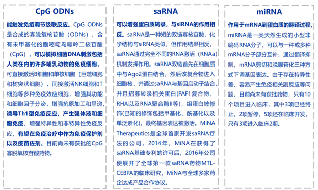 根据小核酸结构、药物机制、作用靶点的不同,发展出了多种类型,包括反义寡核苷酸(ASO)、小干扰RNA(siRNA)、适配体RNA(aptamer RNA)、微小RNA(miRNA)、小激活RNA(saRNA)和CpG寡核苷酸 (CpG oligonucleotide)、核酶(ribozyme)、转运RNA(tRNA)、抗体核酸偶联药物(ARC)等。目前研究最热门的小核酸药物主要是ASO、siRNA 和Aptamer。