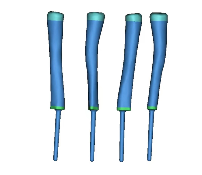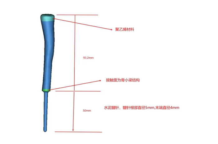 假体根据截骨部分进行仿形设计,桡骨关节面为聚乙烯材料,并设置缝合孔,远端设计髓针嵌入剩余骨质,接触面为骨小梁结构,髓针长度50mm,根部直径5mm,末端直径4mm,髓针设计为水泥髓针