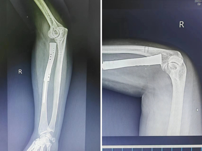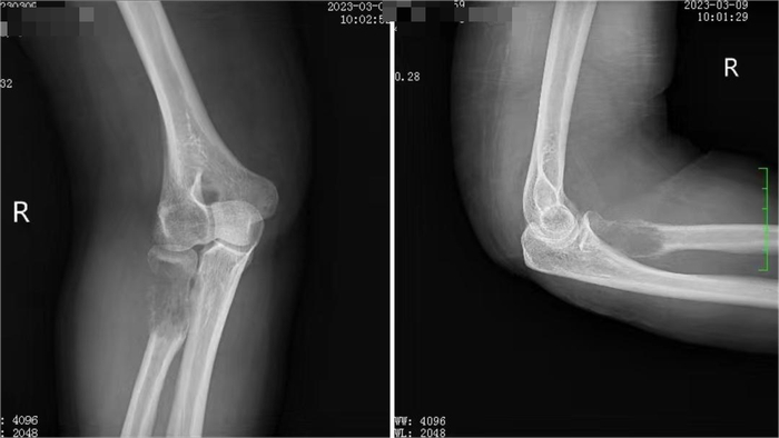 这种手术方法可以扩大切除病变部位,避免截肢手术的风险,同时保留了该病人的肘关节活动功能。如果不进行手术切除,肿瘤可能会进一步增大侵犯关节,严重影响病人的关节功能。经过手术治疗,患者假体位置良好,自觉肌力稍有恢复,目前仍在锻炼中。