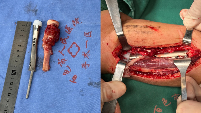该病人因为右上肢疼痛伴活动受限于2023年2月26日入院,经查体发现右上肢轻度水肿,右上肢肌力2级(抬手困难)。在进一步检查和诊断后,病理结果证实该病人此次疼痛是因为骨巨细胞瘤及动脉瘤样骨囊肿引起的。经过肿瘤科的会诊意见,建议对该病人进行右前臂截肢术。骨肿瘤科在韦文主任的主持下,进行了科内病例讨论,并根据患者的CT影像学数据使用3D打印技术制造了一个桡骨假体,以保留病人的肘关节活动功能。于2023年4月16日在全麻下进行手术,由黄承夸主任主刀,廖正文、陆春先、李昊三位助手协助,切除了右桡骨骨肿瘤,置换了右肘关节假体,并进行神经血管探查和骨水泥填充术。