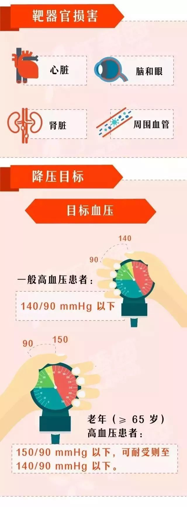 年龄≥60岁者,降压目标值是收缩压<150mmHg 和/或舒张压<90 mmHg,如果能耐受还可进一步降低至140/90mm Hg。对于合并糖尿病和慢性肾脏病者,收缩压目标值<140mmhg。