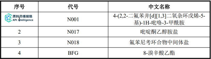 拟建项目产品N001、N017、N018、BFG均为医药中间体。