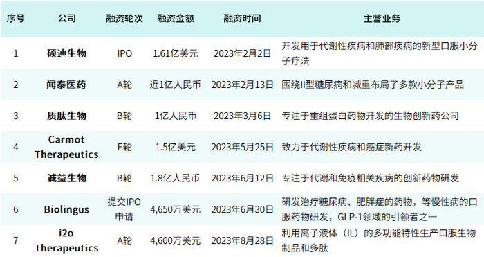 除此之外,2023年1-9月,GLP-1相关药企也融资不断。据不完全统计,这段时间国内外共发生7起融资,融资总金额高达4.6亿美元。