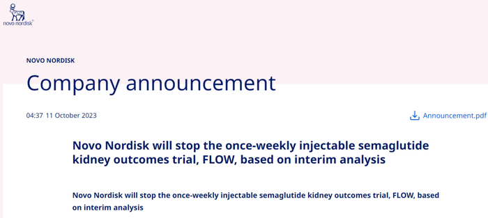 10月11日,诺和诺德宣布提前终止其GLP-1药物司美格鲁肽(商品名:Ozempic)治疗合并肾功能不全二型糖尿病患者和慢性肾病患者的三期临床FLOW试验。