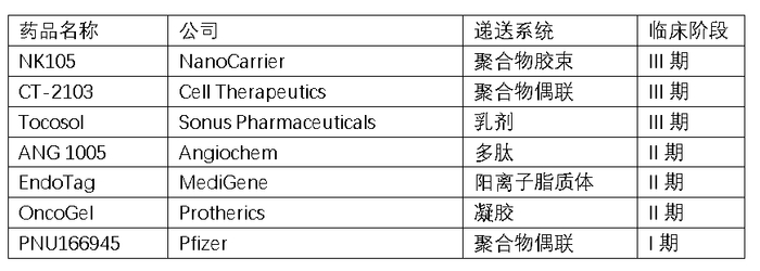 以上几个产品均是针对紫杉醇注射液毒性及溶解性进行改良,然而Genexol PM®在物理上不稳定,对多药耐药肿瘤治疗无效。Abraxane®表现出有限的肿瘤摄取、肿瘤消除和更高的半数抑瘤浓度。更多的递送系统进一步开发,根据文献报道与Genexol PM®相比,聚乙二醇-共乳酸和d -a-生育酚聚乙二醇- 1000琥珀酸盐组成的紫杉醇混合胶束对多药耐药肿瘤细胞有效;与Abraxane®相比,重组嵌合多肽结合的紫杉醇纳米颗粒具有2倍的全身肿瘤暴露,肿瘤摄取和几乎完全的肿瘤消退;紫杉醇载聚己内酯-co- d -a-生育酚聚乙二醇1000琥珀酸纳米颗粒的最大抑制浓度是Abraxane®的8倍;以下是一些进入临床的新型紫杉醇制剂。