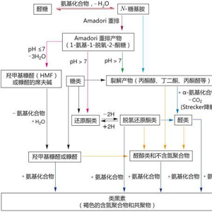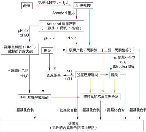 美拉德反应具体涉及许多类型的化学反应,其首个反应始于氨基与糖的还原性末端的半缩醛羟基形成糖胺,此N-取代的醛糖胺可经历Amadori重排产生α-氨基酮糖(1-氨基-1-脱氧-2-酮糖),亦可产生许多其他的平行或系列反应,最终导致棕色色素的形成并产生多种挥发性化合物。