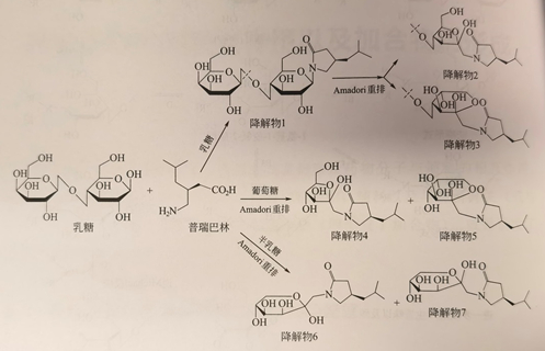 目前该药物中监控的美拉德反应主要监控前段,一般是Amadori重排产物。普瑞西林是用于治疗神经性疼痛的抗惊厥药物,在其胶囊剂的长期稳定性研究中,连用普瑞西林酰胺降解物在内,共发现七个主要降解产物。这七个降解产物是活性药物成分API分别与乳糖(首要的辅料)、乳糖中其他组分(半乳糖和葡萄糖)发生美拉德反应所生成的。所有这些降解产物都具有内酰胺结构,这说明环化反应很容易发生而形成五元内酰胺环。