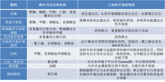 表2 辅料中带入的杂质及可能的不相容反应