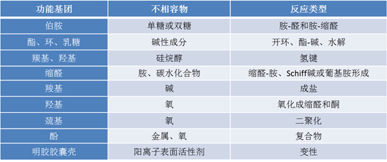 在制剂处方开发前期,可以通过分析原料药化学结构和文献调研方式,了解辅料与药物间、辅料杂质与药物间、辅料与辅料间可能的相互作用情况,避免处方设计时选择不宜的辅料。或者在原辅料相容性研究过程中,尽早发现可能存在反应的辅料,通过前期处方优化,避免美拉德反应或其他反应的发生(可参考表1和表2)。