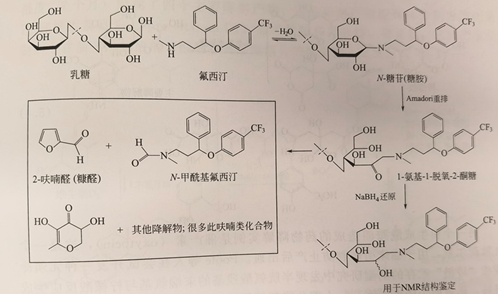 氟西汀是经典的抗抑郁药,其分子结构中含有仲胺基团,在它的多个商业剂型的研究中发现,辅料中存在乳糖时,会形成N-糖基胺以及Amadori重排生成的降解产物。然而,此Amadori重排所生成的降解产物的结构以如下方法得以确认:将重排产物的酮羰基还原,以防止形成两种环化形式。此外,在加速稳定性实验条件下(40℃、相对温度75%)还发现,Amadori反应的重排产物还会发生氧化降解,生成N-甲酰基氟西汀和一些挥发性的降解产物。