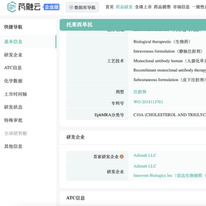 药融云数据www.pharnexcloud.com显示:2023年8月15日,信达生物研发的PCSK-9抑制剂托莱西单抗注射液(tafolecimab,研发代号:IBI306)获得国家药品监督管理局(NMPA)批准上市,治疗原发性高胆固醇血症(包括杂合子型家族性和非家族性高胆固醇血症)和混合型血脂异常。托莱西单抗成为国内首款获批的自主研发的重组全人源抗PCSK-9单克隆抗体。本品相关专利WO-2018113781。最早与Adimab合作开发。