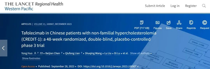 2023年10月,托莱西单抗注射液在中国非家族性高胆固醇血症(non-FH)受试者中的III期临床研究(研究代号:CREDIT-1)结果在国际期刊柳叶刀子刊The Lancet Regional Health-Western Pacific在线发表,本文第一作者和通讯作者为北京大学第一医院霍勇教授。