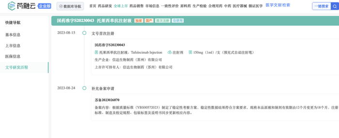 2023年8月底,托莱西单抗注射液开始正式在中国市场销售,药融云数据www.pharnexcloud.com显示:150mg(1ml)/支/盒的价格为1388.00元人民币。