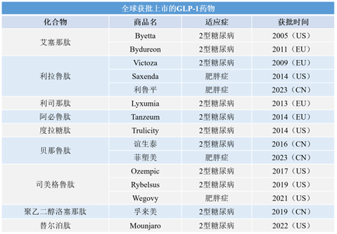 在聊司美格鲁肽之前,我们需先了解一下GLP-1激动剂。GLP-1激动剂即胰高血糖素样肽– 1受体激动剂(GLP-1RA)。胰高血糖素样肽 – 1(GLP-1)是人体胃肠道黏膜天然分泌的一种“肠促胰素”,它在与受体GLP-1R结合后,将刺激胰岛素分泌,抑制胰高血糖素,从而促进葡萄糖的代谢,降低血糖。在2型糖尿病患者中,正是因为GLP-1的分泌水平的下降,才会导致血糖的升高[1]。作为一个颇具潜力的抗糖药物靶点,国外制药巨头,如诺和诺德、礼来和阿斯利康早在几十年前就开始了该类药物的研发,全球首个获批上市的GLP-1药物为Amylin和礼来联合开发的艾塞那肽,2005年由FDA批准上市,适应症为2型糖尿病,每日皮下注射两次。2009年,GLP-1药物中的第一款明星产品- 利拉鲁肽诞生,利拉鲁肽是由诺和诺德研发的全球第二款GLP-1RA类降糖药,也是第一个获批用于治疗肥胖症的这类药物,相比于艾塞那肽,利拉鲁肽的优势在于提高了药物在体内的半衰期,一日注射一次即可。因此利拉鲁肽一经推出就迅速成为了最畅销的糖尿病药物,在2018年销售额达到巅峰,约合美金43亿。而后又出现了多款长效GLP-1药物,如礼来的度拉糖肽、诺和诺德的司美格鲁肽,以及礼来最新研发的替尔泊肽等。